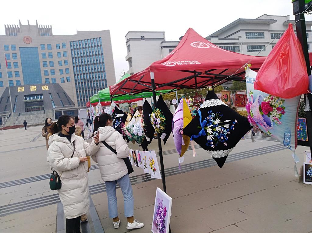 在达朝辉老师的精心指导下,义卖现场摆满了各种精品手工美术作品,有丝带绣、粘土画、纸艺玫瑰花、毛线装饰画等。员工们将各种废旧物品创新利用,用自己的巧手打造成一件件精致的衣服、装饰画、包、玩教具等。展出现场吸引了校园内外师生驻足欣赏购买。