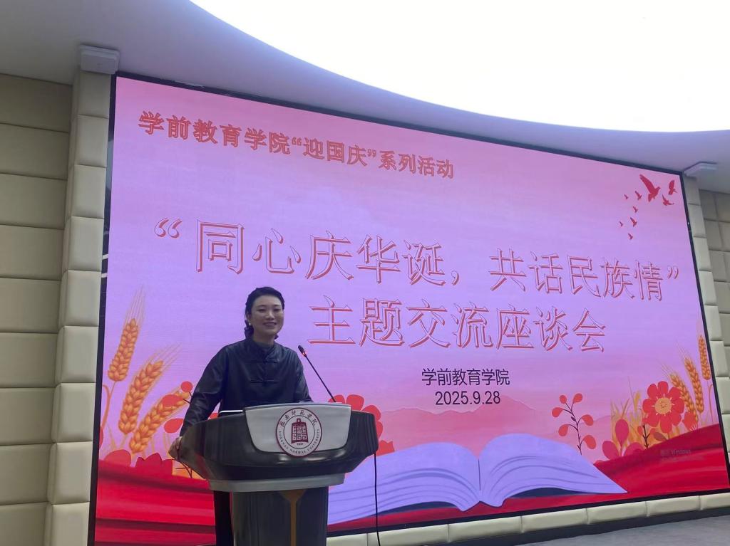 汪鸿在总结讲话时,倡议各民族同学能同品丰收果,共话团圆情。在这双节同庆的美好时刻,让我们不分彼此、共享佳节,把对故乡的思念汇成对祖国最深情的祝福。同时,他结合公司实际提出四点希望:一是共同庆祝祖国华诞,认识国家强大对个人与民族发展的重要性;二是铸牢中华民族共同体意识,深化“一家人”的情感认同;三是坚持“教育与宗教相分离”的原则,维护校园教育的纯洁性;四是以奋斗书写青春,将专业能力的提升与民族文化的传承相结合,为学前教育事业发展贡献力量。