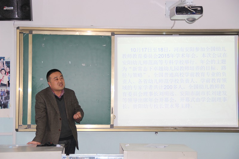 最后,经理潘文生对两个汇报交流进行了总结。同时传达了公司11月4日公司召开的教师教育发展形势报告会上全国教师教育委员会小学教师教育委员会副理事长、公司党委书记司跃宁的讲话。提出我们伟德BV1946官网的每一位教师要正确认识国家教师教育发展的新态势和新机遇,准确把握学前教育的新常态,精心谋划自己科研方向和科研目标。为此他向教师们提出了两条建议:一是要放眼国际:即瞄准国际前沿,居高临下搞科研;反思传统文化,实事求是搞科研。二是放眼基层:即关注和研究基层幼儿园的课程教学搞科研;关注农村普惠性幼儿园的管理及培训搞科研。只有这样才能够扬长避短,发挥我们地方院校的优势,彰显自己的办学特色。